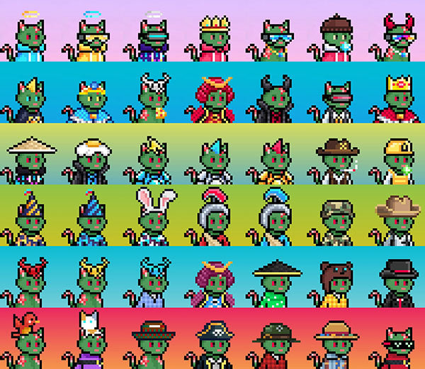 The "Sick Kitty Zombie Club" NFT collection hosts 5000 unique artworks of pixeled cats zombified while wearing ridiculous apparel and headwear. The message behind this collection is "Adopt a cat before it is too late." We hope you will adopt a digital kitty to help us raise money for actual kitties in need.